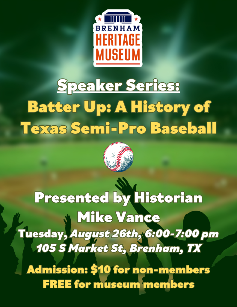 Step up to the plate with the Brenham Heritage Museum as we welcome Historian Mike Vance for an unforgettable presentation: “Batter Up: A History of Texas Semi-Pro Baseball”