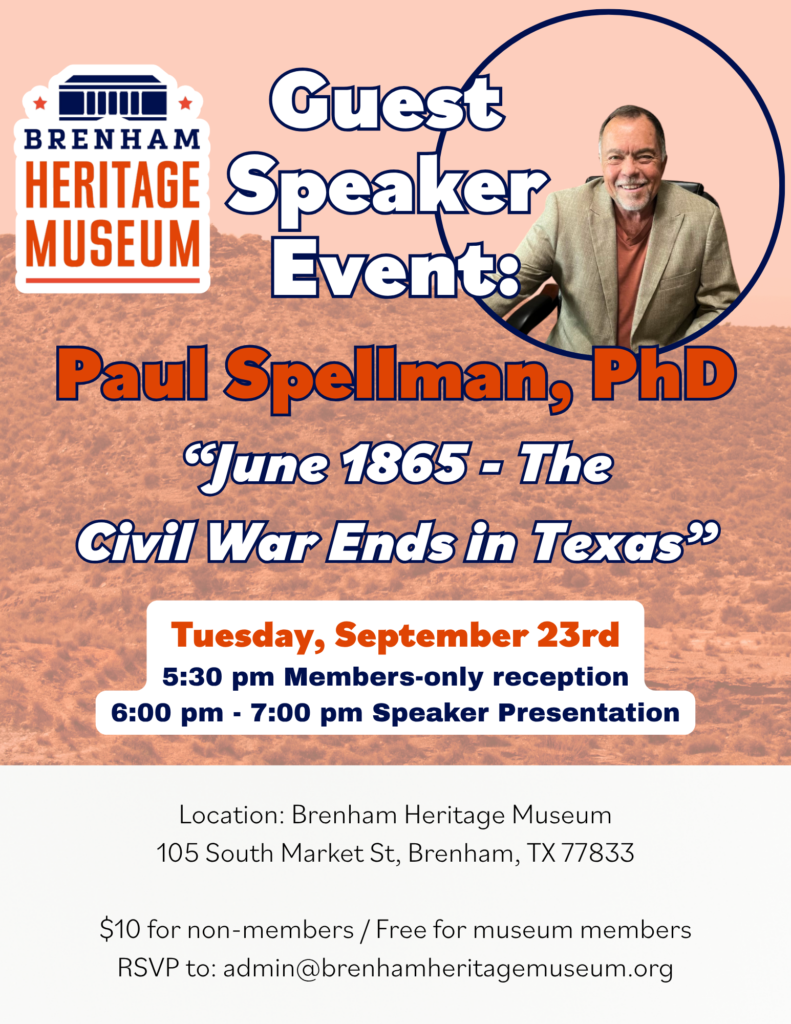 Mark your calendars for Tuesday, September 23rd, when noted historian and author Dr. Paul Spellman returns for a compelling presentation: “June, 1865 – The Civil War Ends in Texas.”